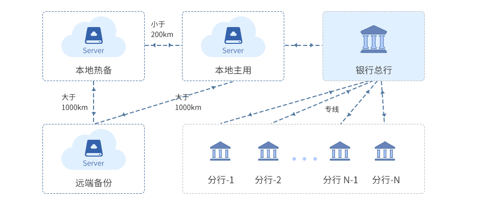 银行数据集中到总行,系统容灾两地三中心,本地主备两节点双活,异地一节点与本地节点即时同步